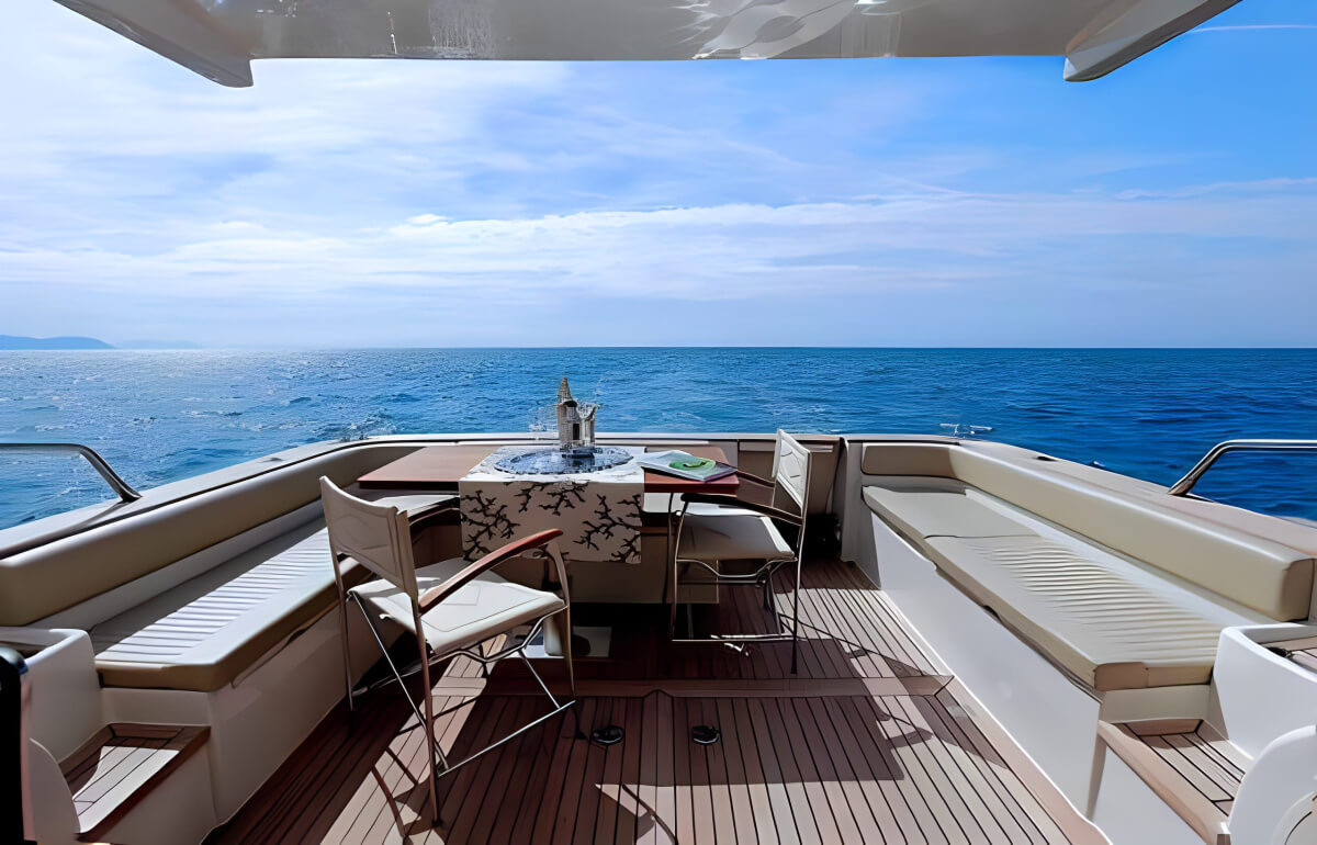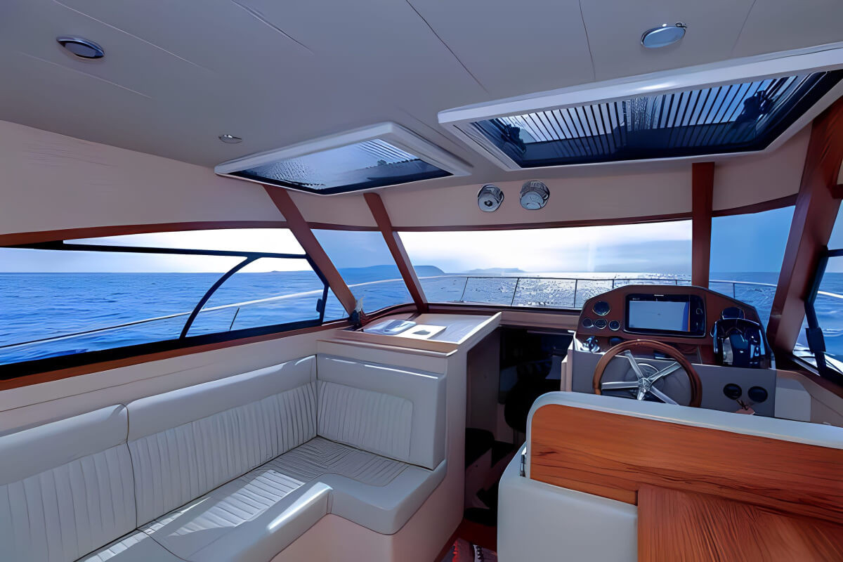 A beautifully designed lounge-style helm station, complete with a comfortable dinette and fully equipped galley. Below deck, you’ll find two elegant cabins and one refined bathroom, offering ample comfort for day cruises or weekend escapes.