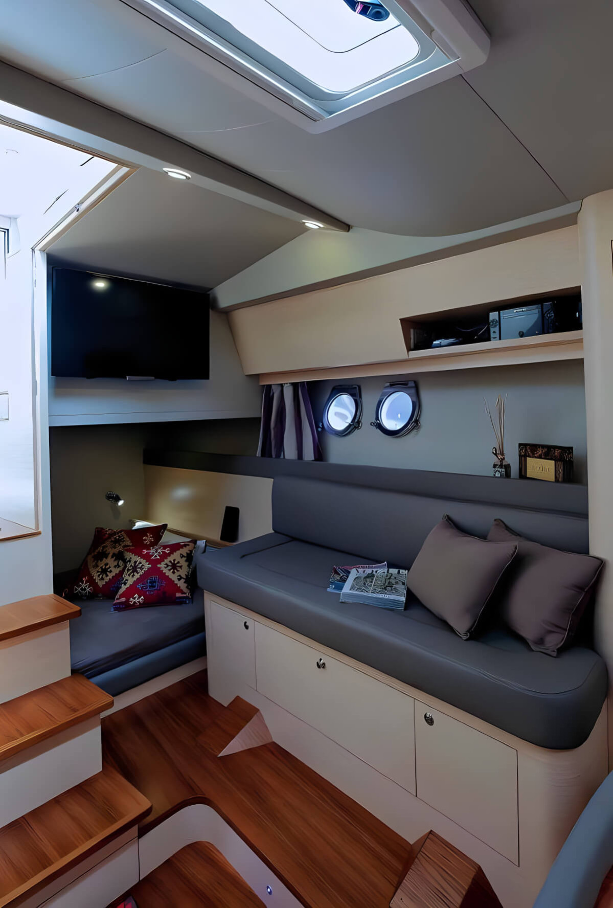 Powered by twin Volvo Penta D6 diesel engines (340/380 hp each), this yacht delivers the perfect balance between power, efficiency, and quiet cruising, making every journey a pleasure.