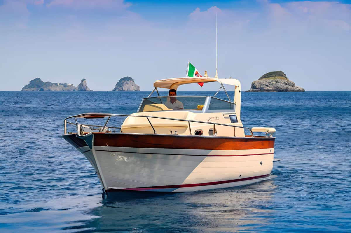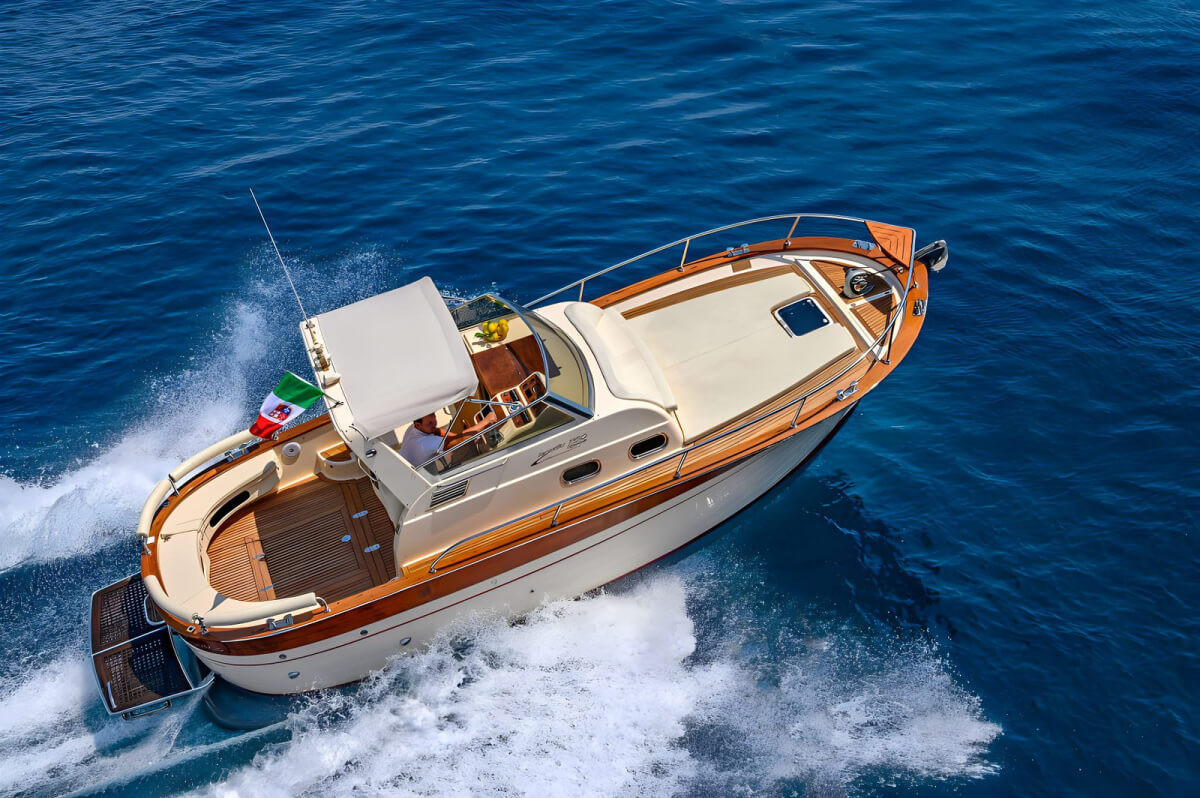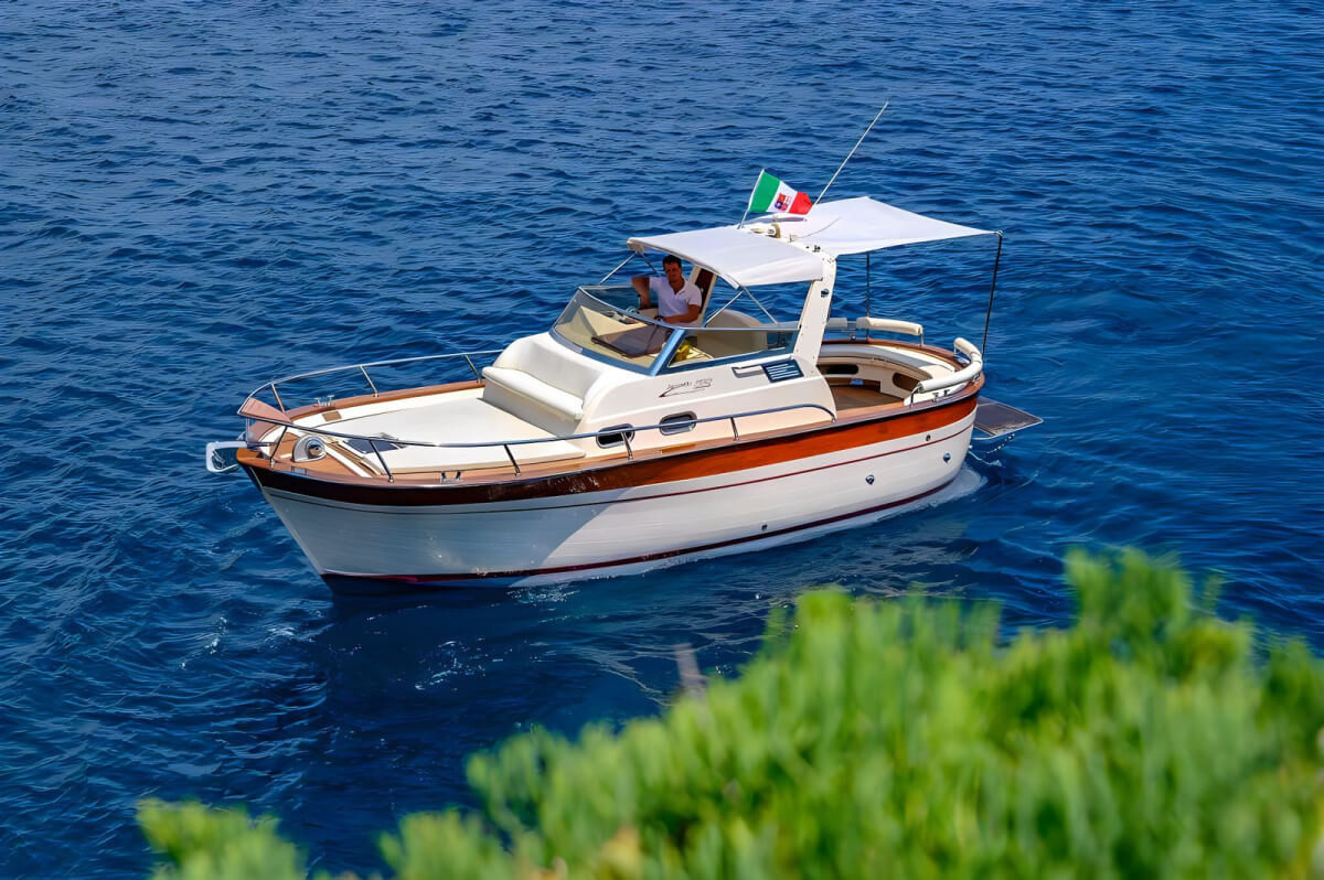 Jeranto 28 Classic Gozzo, a traditional Italian boat designed for unforgettable private boat tours around Capri, Positano, and the Amalfi Coast. Elegant, comfortable, and exceptionally seaworthy, this iconic gozzo combines artisanal craftsmanship with modern amenities, offering a smooth and relaxing cruising experience for up to 6 guests.